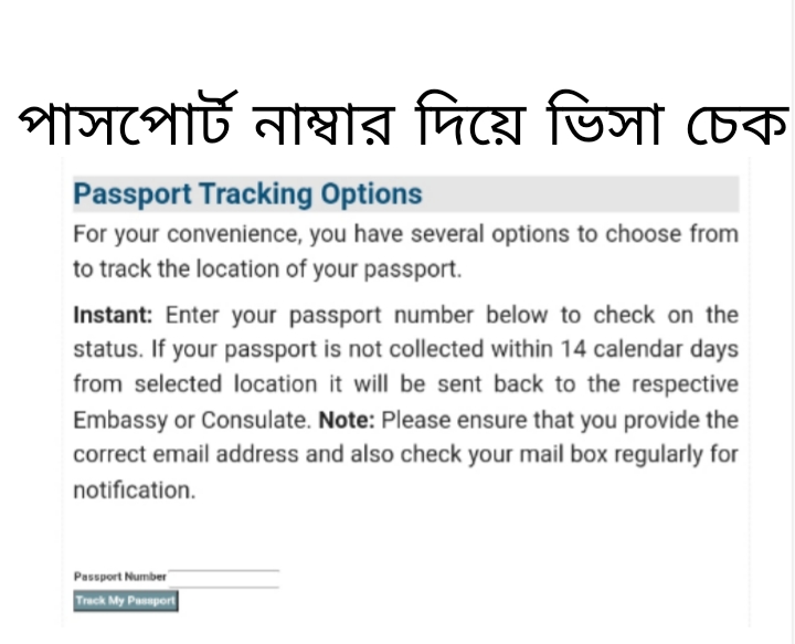 - এরপর Passport Tracking Oftions এ ক্লিক করে Passport Number অপশনে পাসপোর্ট নাম্বার লিখে Track my Passport এ ক্লিক করে আপনার ভিসার Status সম্পর্কে জানতে পারবেন।