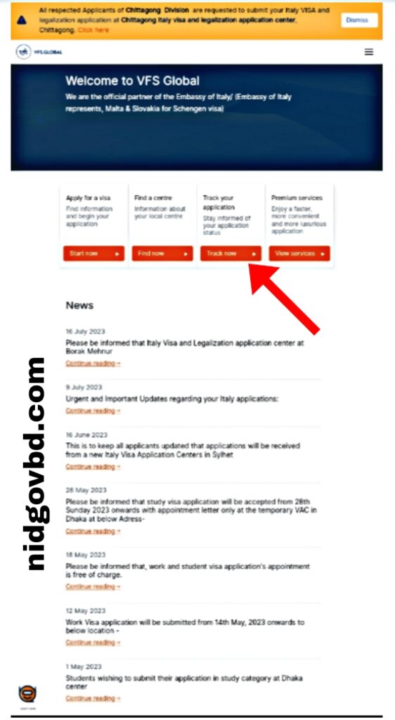 ইতালির ভিসা চেক করার জন্য প্রথমে আপনাকে এই ওয়েবসাইটে যেতে হবে।এছাড়াও আপনি visa.vfsglobal লিখে সার্চ দিয়ে এই ওয়েবসাইটে প্রবেশ করতে পারেন।