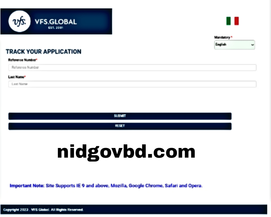 উপরের পেইজে আপনার ইতালি ভিসার Reference Number লিখুন। দ্বিতীয় খালি বক্সে আপনার নামের লাষ্টের অংশ লিখুন।